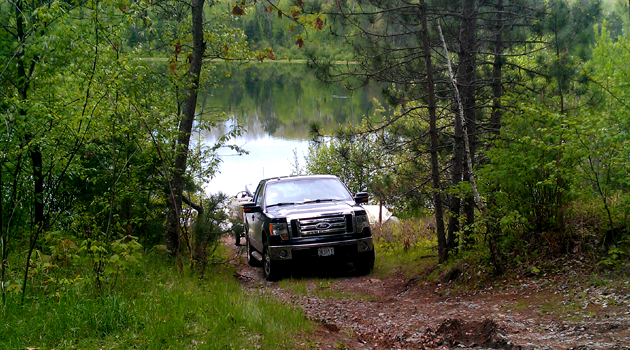 Wilderness lakes often require the use of lighter, smaller boats due to shallow unimproved landings and roadside access. My personal preference is to fish out of the comforts of my 16 foot fiberglass Lund where launches are deeper and outboards are allowed. We use trucks and 4×4 vehicles to launch my boat. Other than carelessly towing with my front wheel drive vehicle we’ve rarely experienced any problems or gotten stuck. My boat is light enough, under 1,200 pounds fully rigged, that it can be launched from most boat landings and any types of surfaces. It is also shallow enough that it can float in less than a foot of water and get through anywhere.